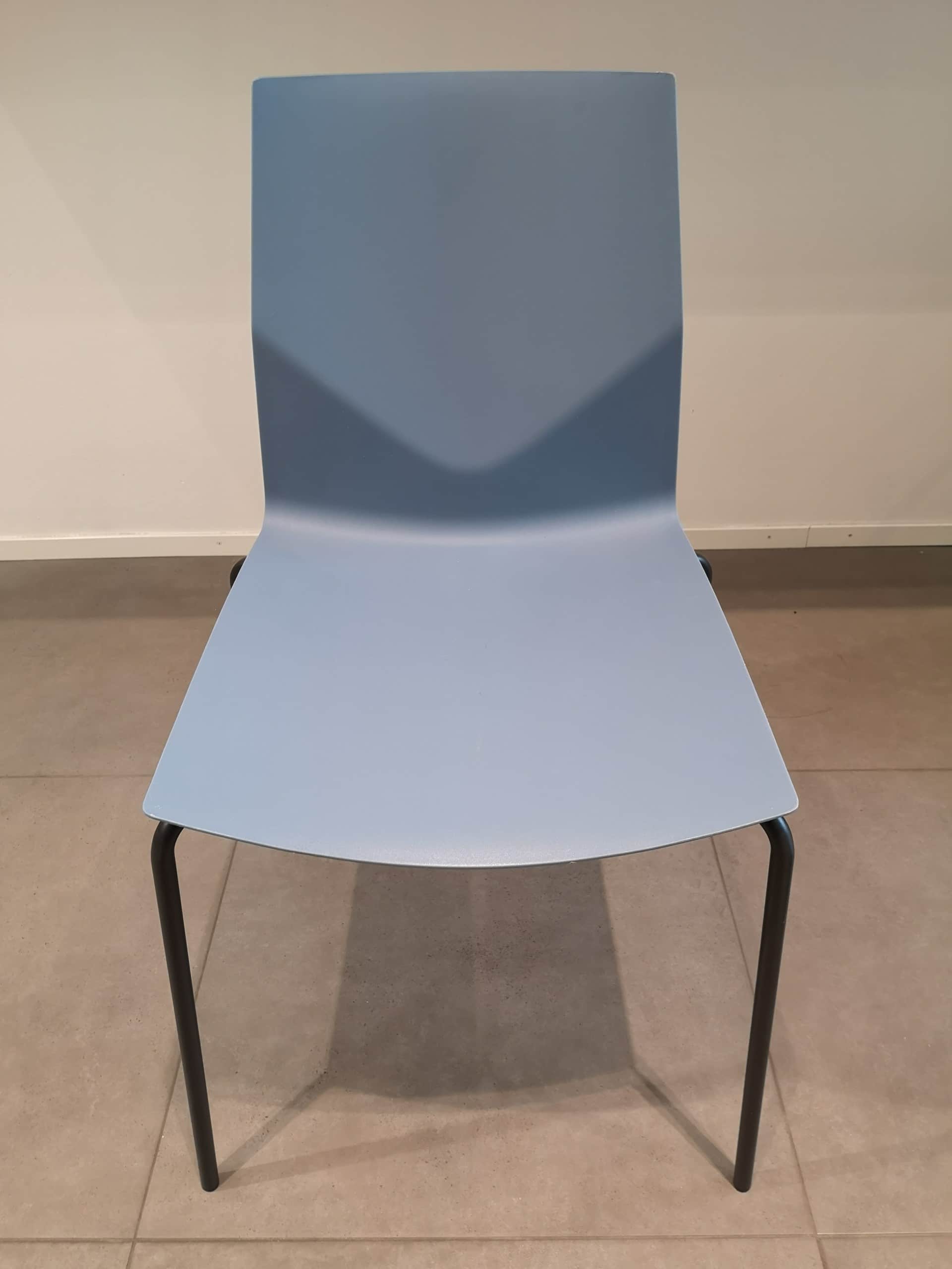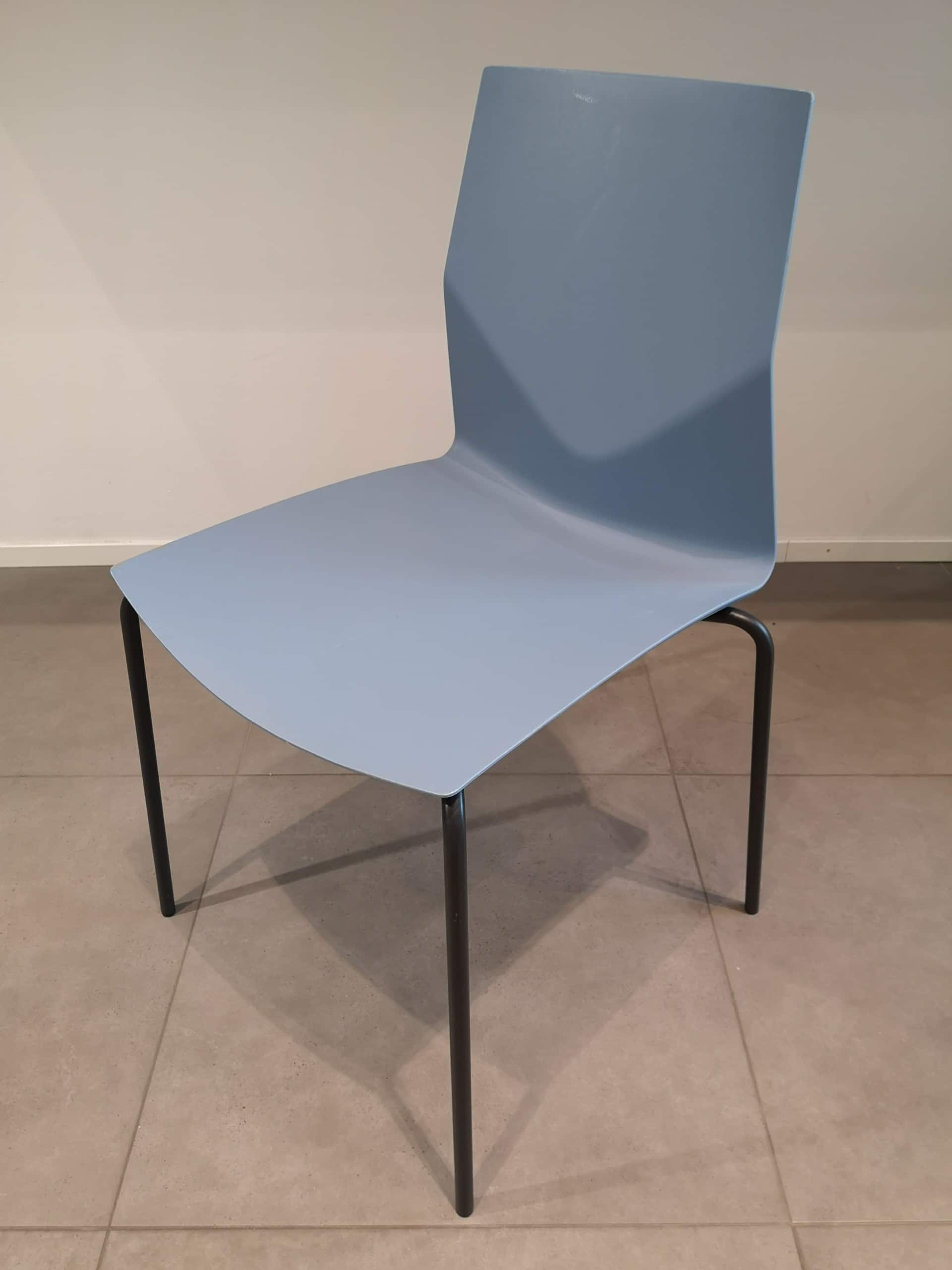 Sete og rygg i plast (blå). Ben i metall (svart).