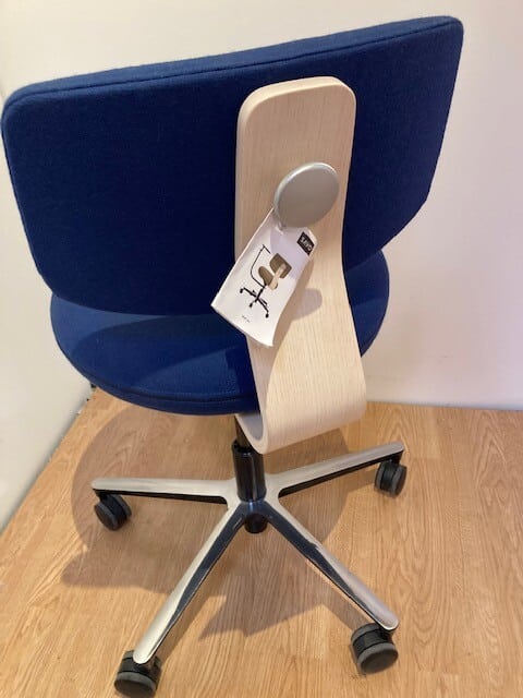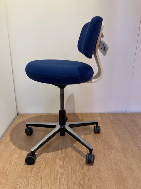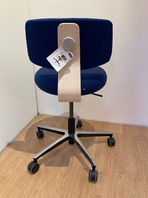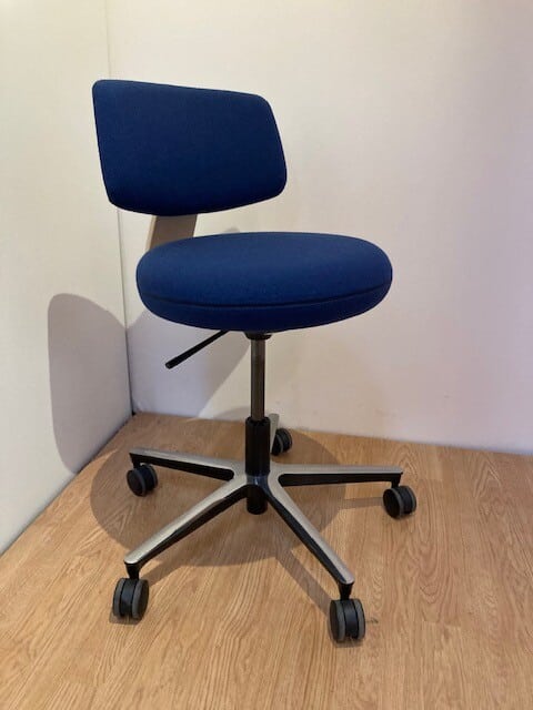 Sete og rygg i stoff (blå). Kryssfot i metall (aluminium). Høydejusterbar
