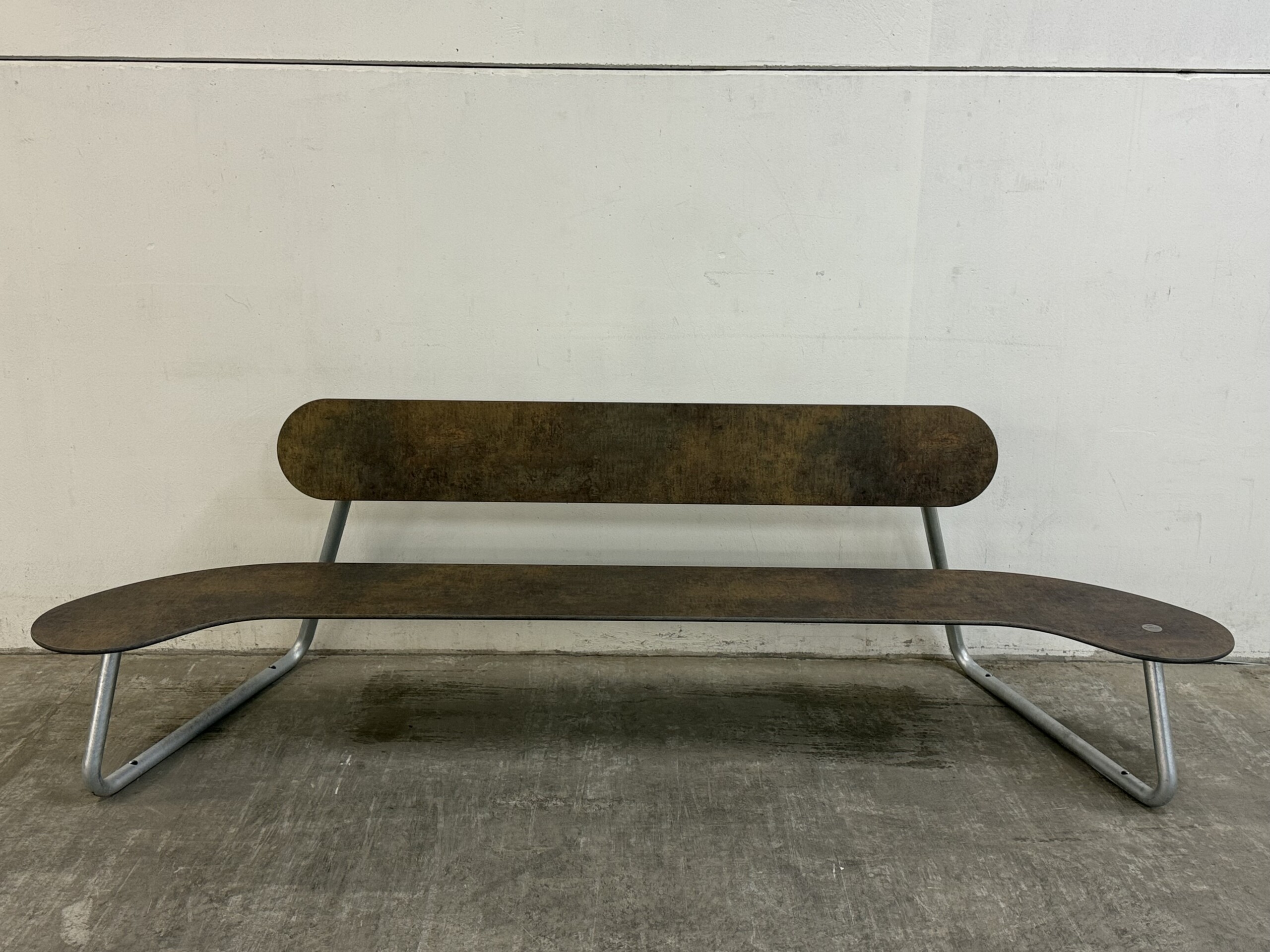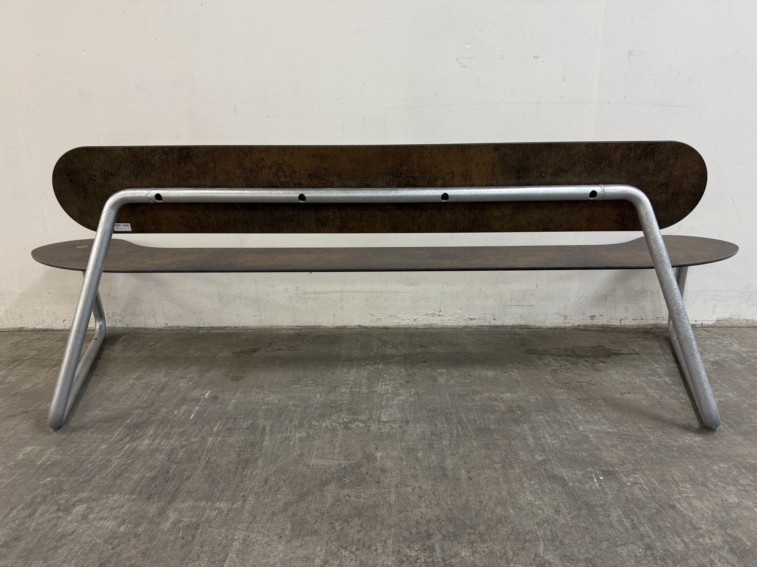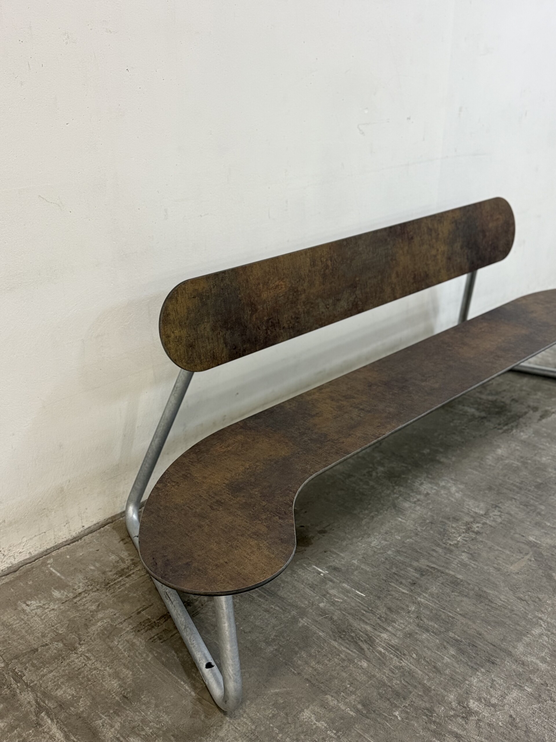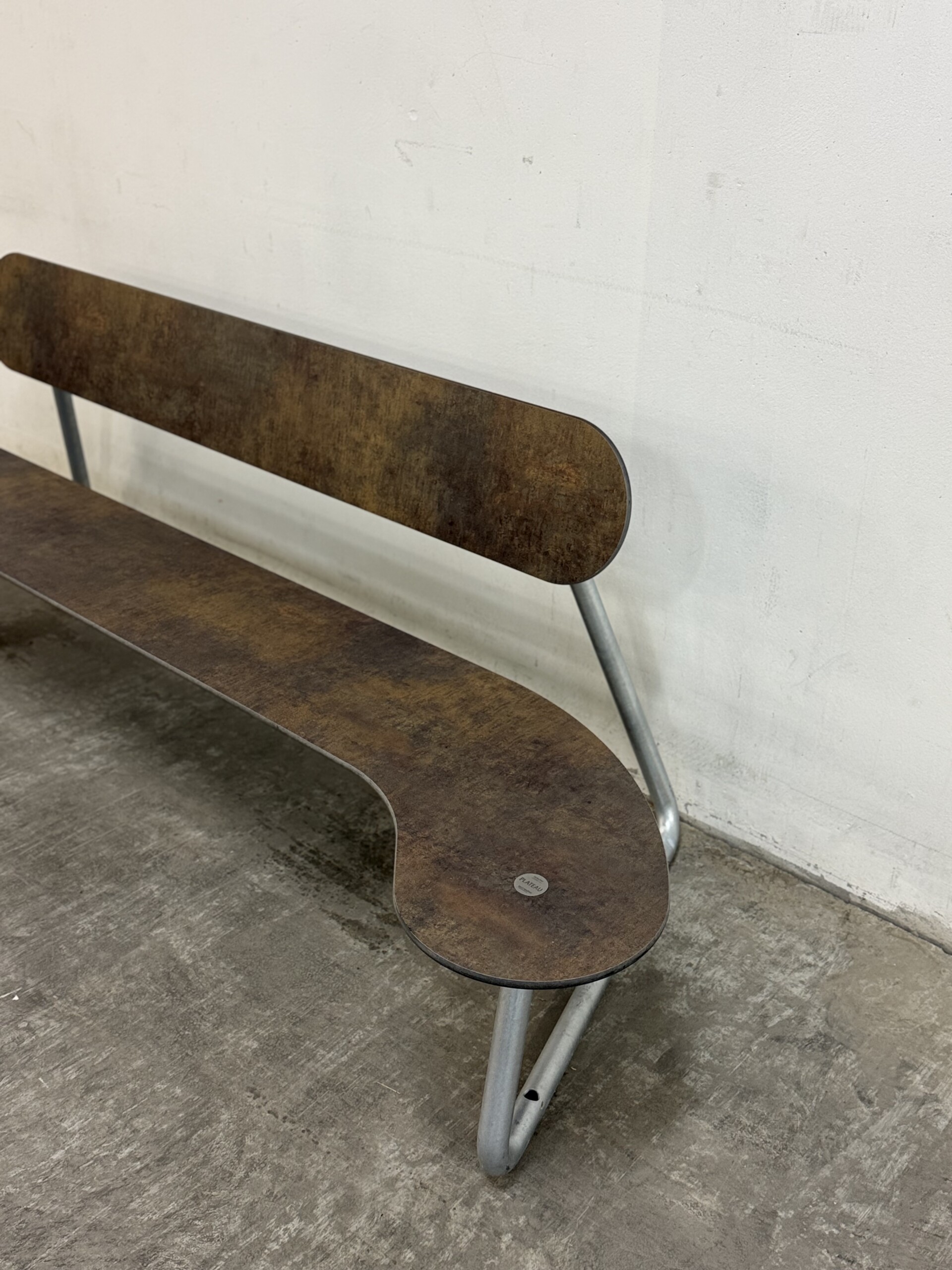 Sete og rygg i tre (brun). Meiestativ i metall (aluminium).