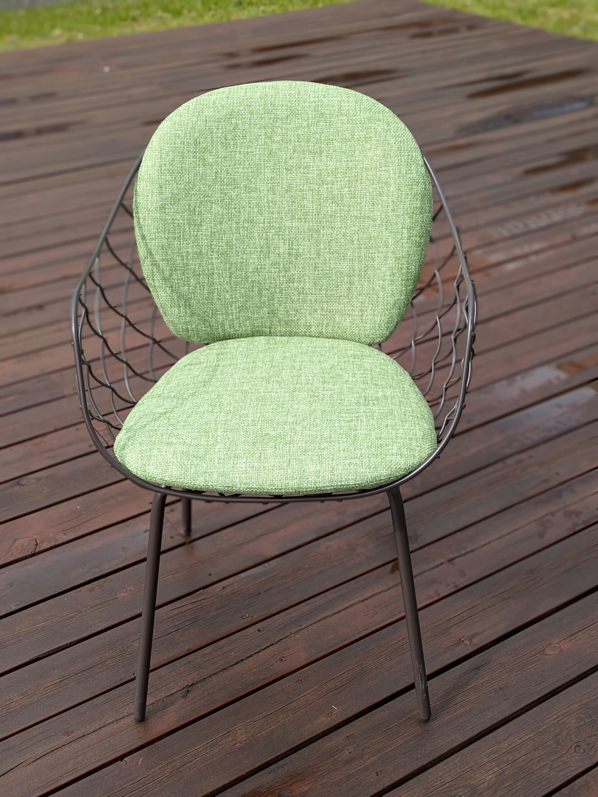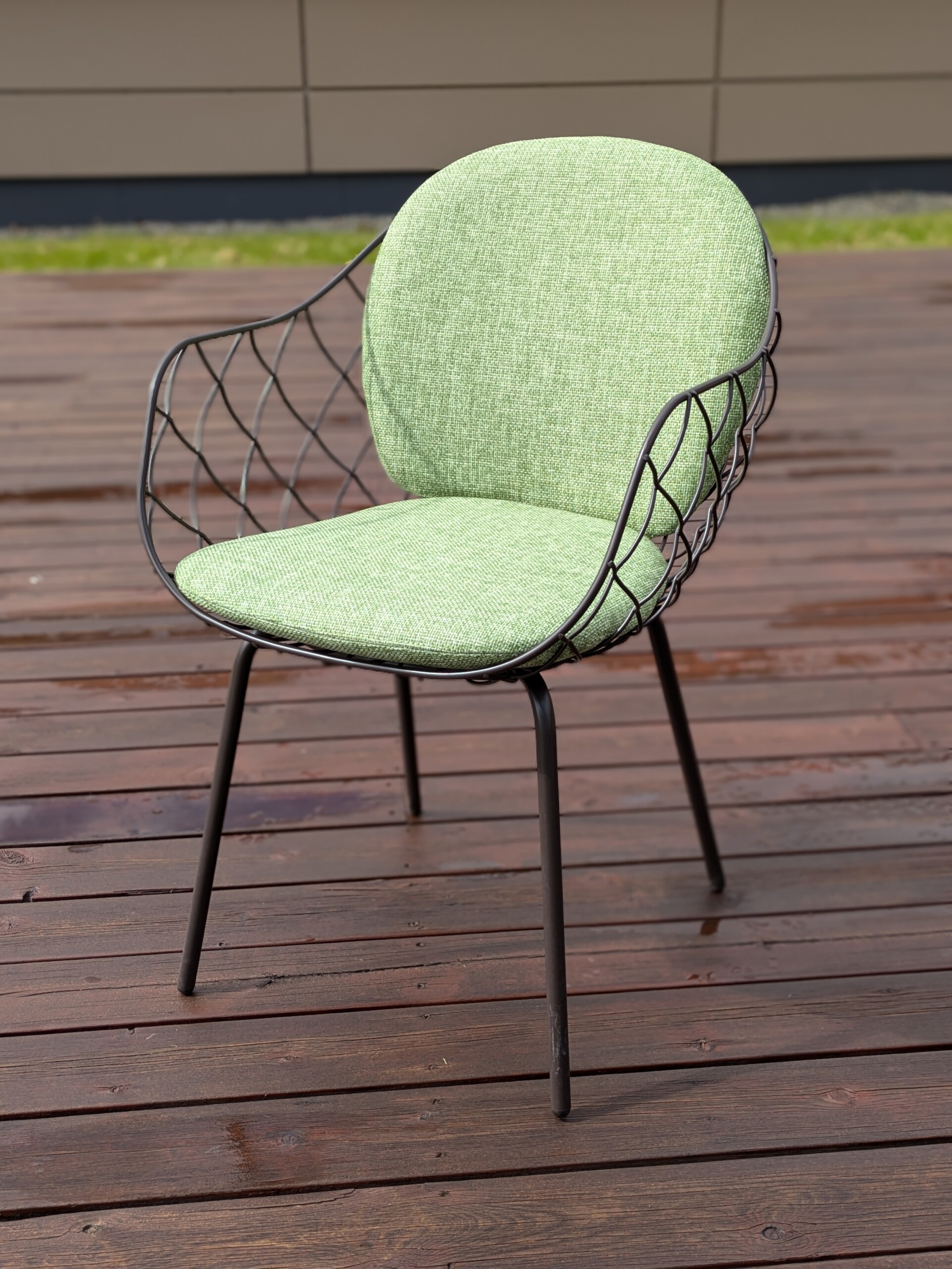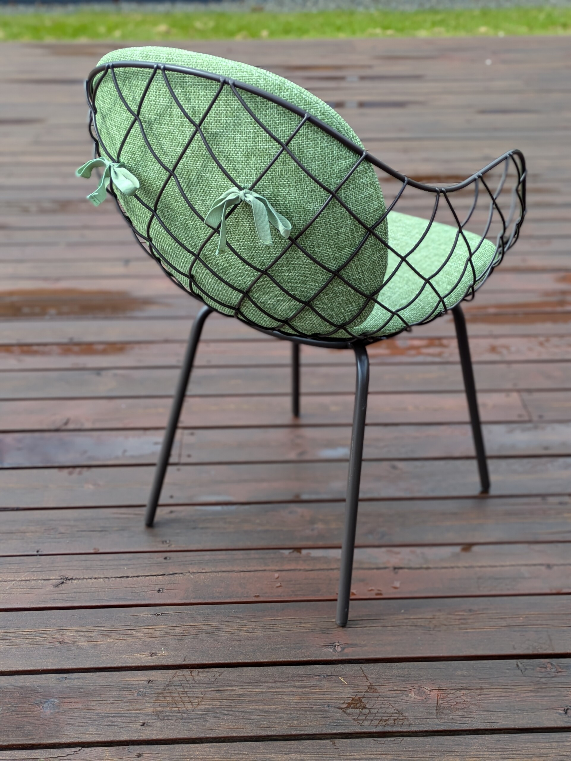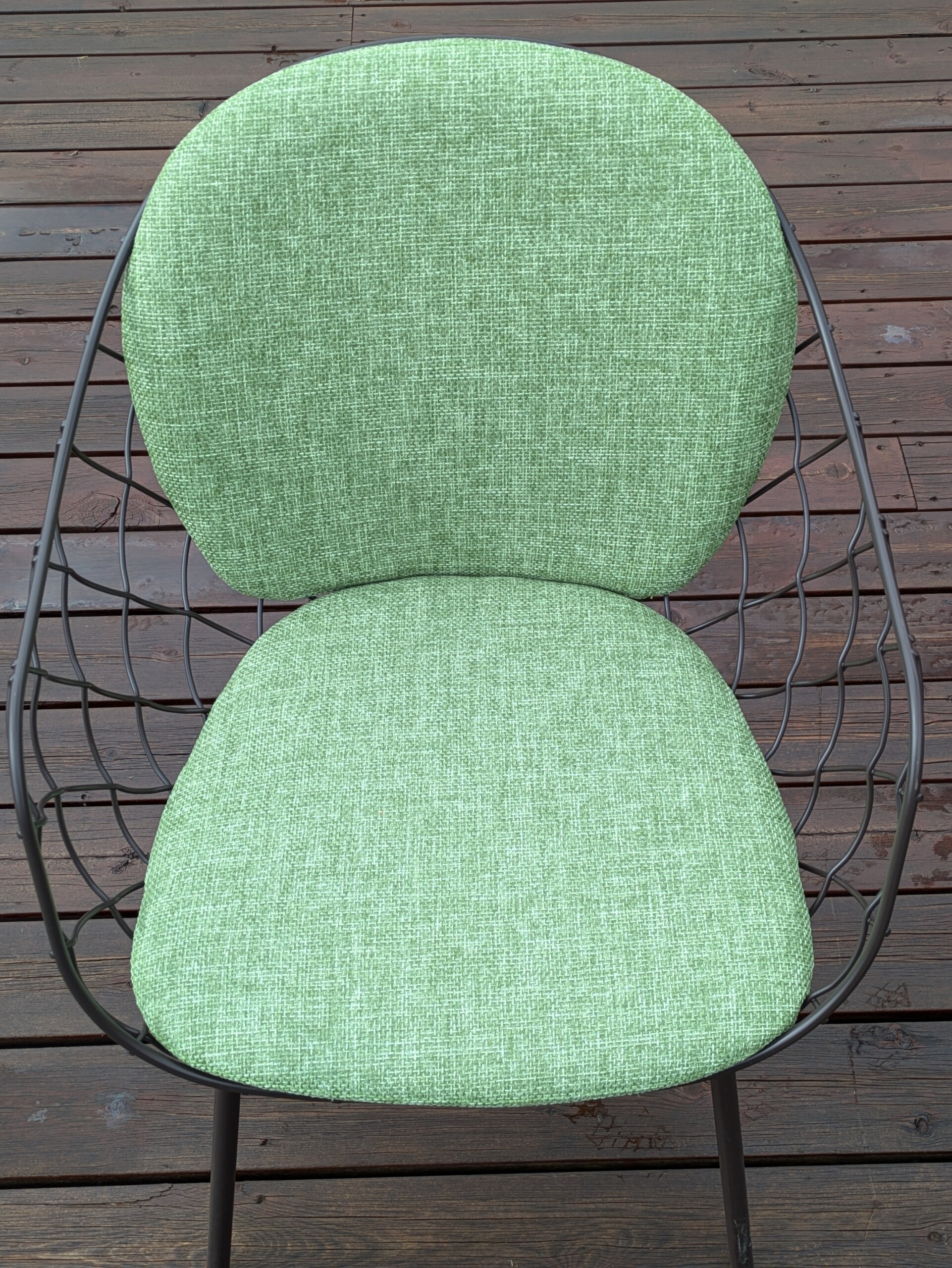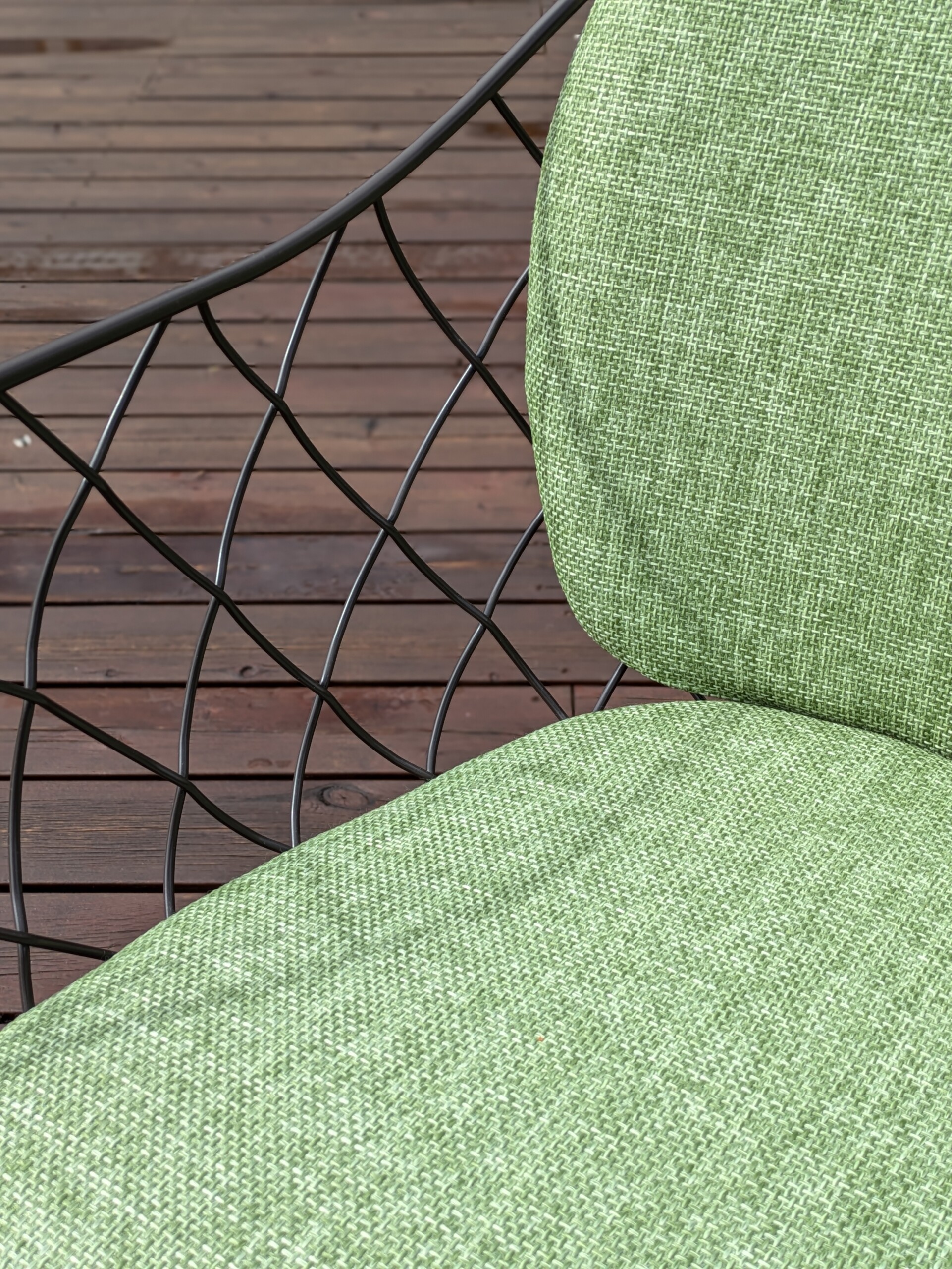 Sete og rygg i stoff (grønn). Ben i metall (brun).