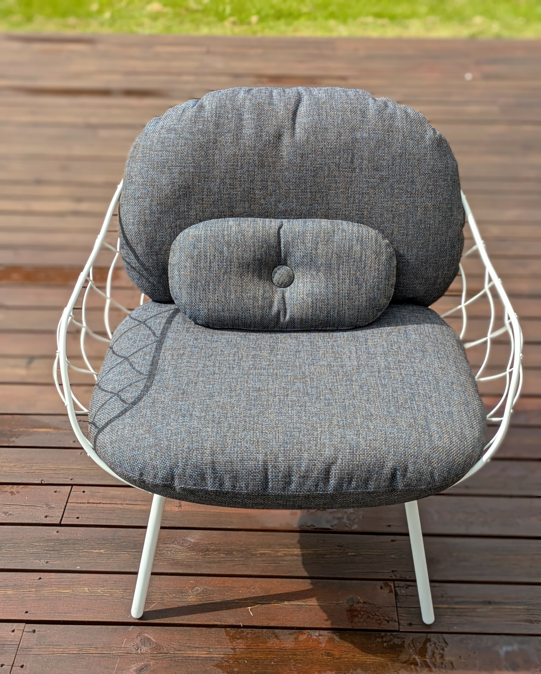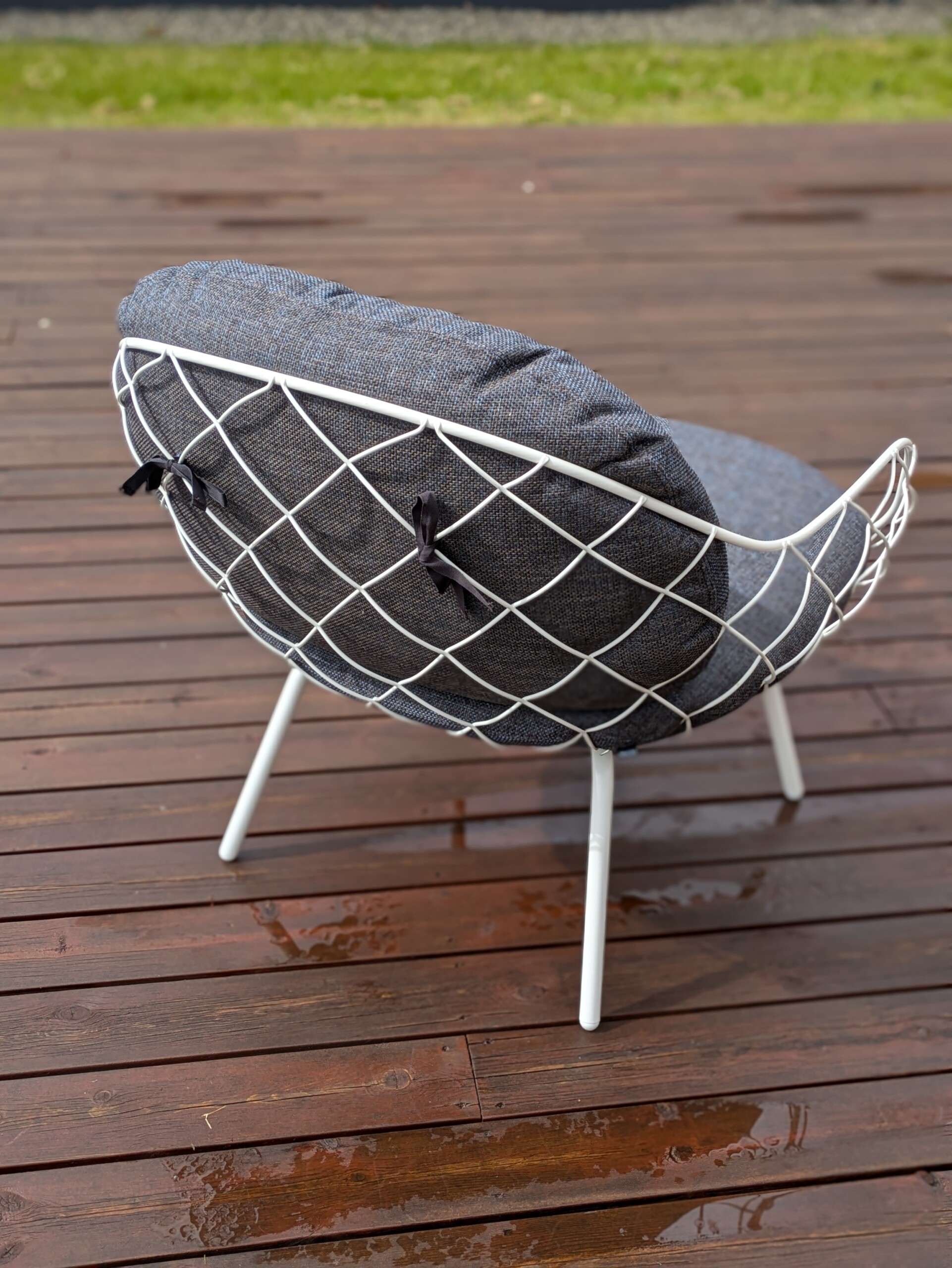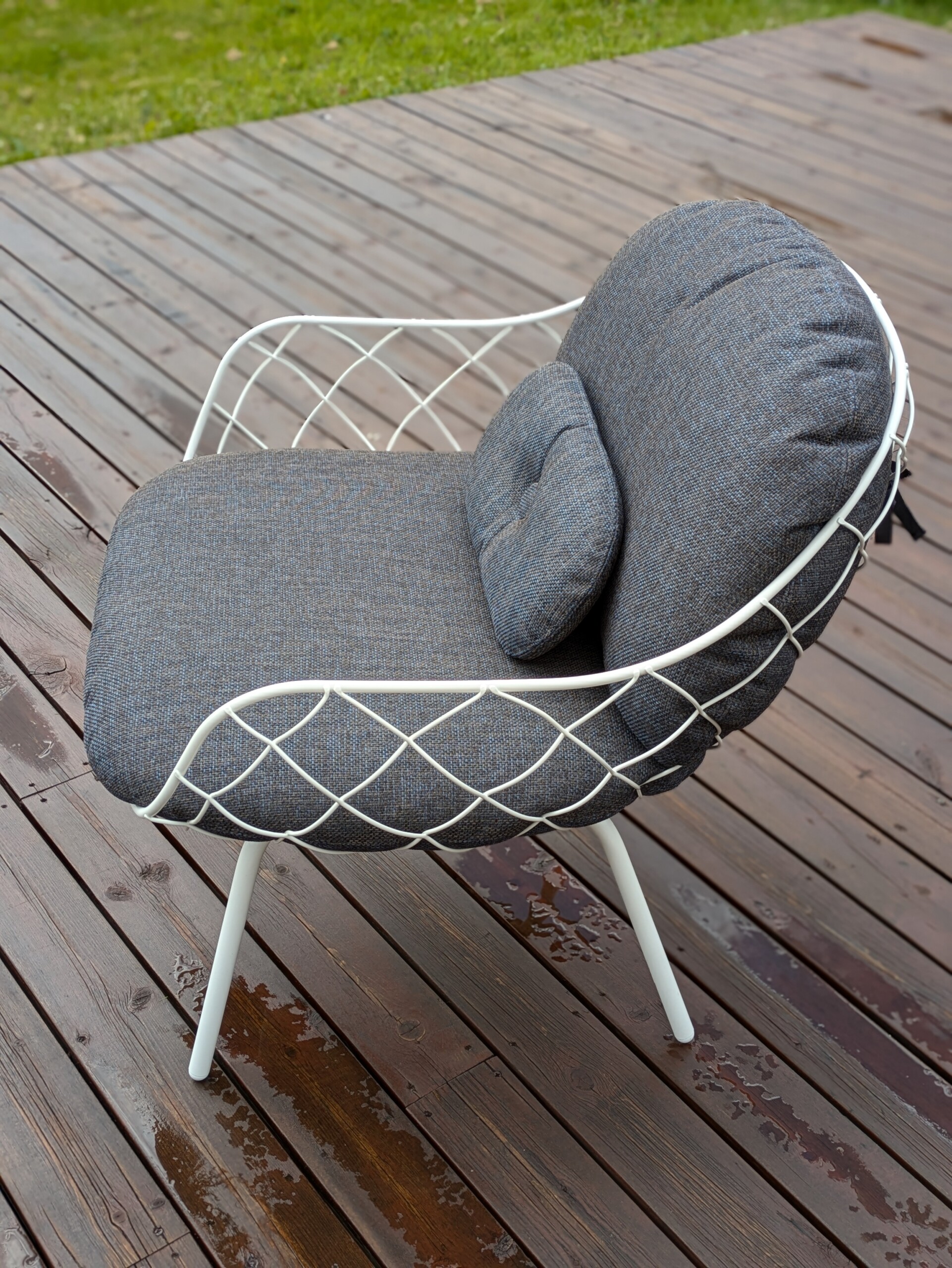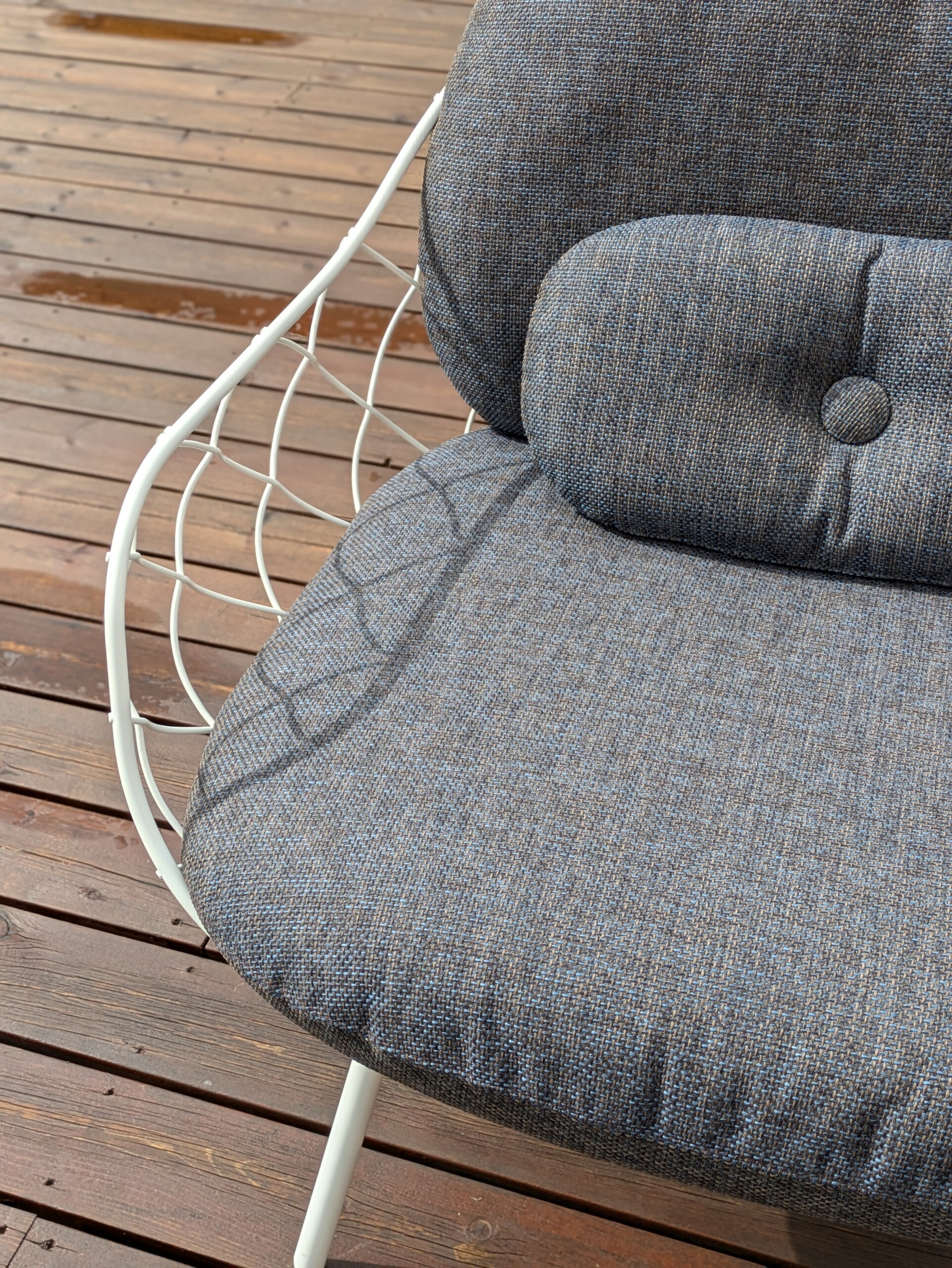 Sete og rygg i stoff (blå). Ben i metall (hvit).